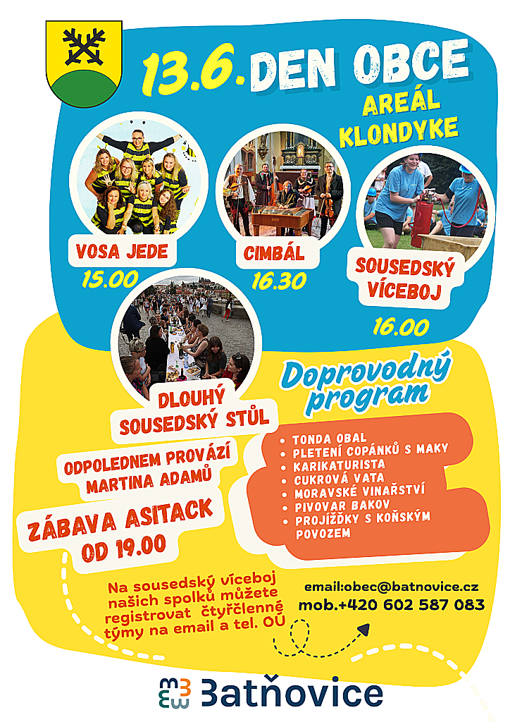 Srdečně Vás zveme na tradiční Den obce Batňovice plný hudby, zábavy a příjemných setkání se sousedy i přáteli. Čeká Vás vystoupení kapely VOSA JEDE, cimbálová muzika, oblíbený sousedský víceboj, program pro děti, občerstvení a mnoho dalšího.