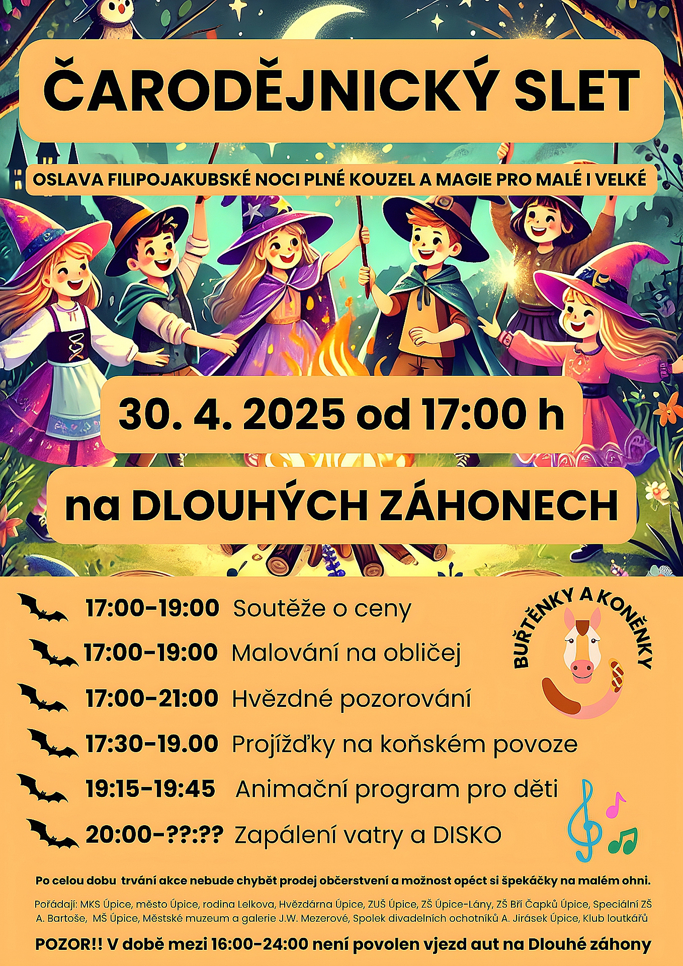 Čarodějnický slet nabídne pestrý program, který startuje ve čtvrtek 30. dubna 2025 úderem 17. hodiny.