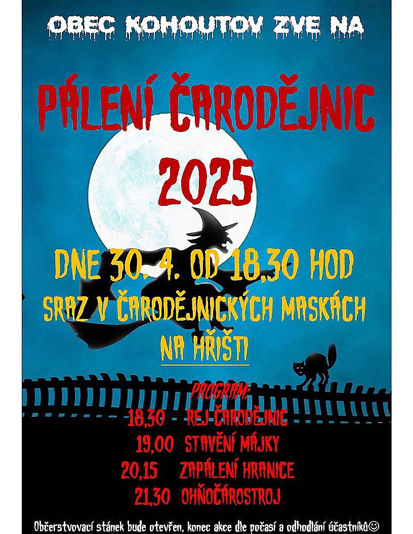 Kromě tradičního pálení čarodějnic se můžete těšit na skvělou zábavu, čarodějnický rej, stavění májky, ohňostroj.
