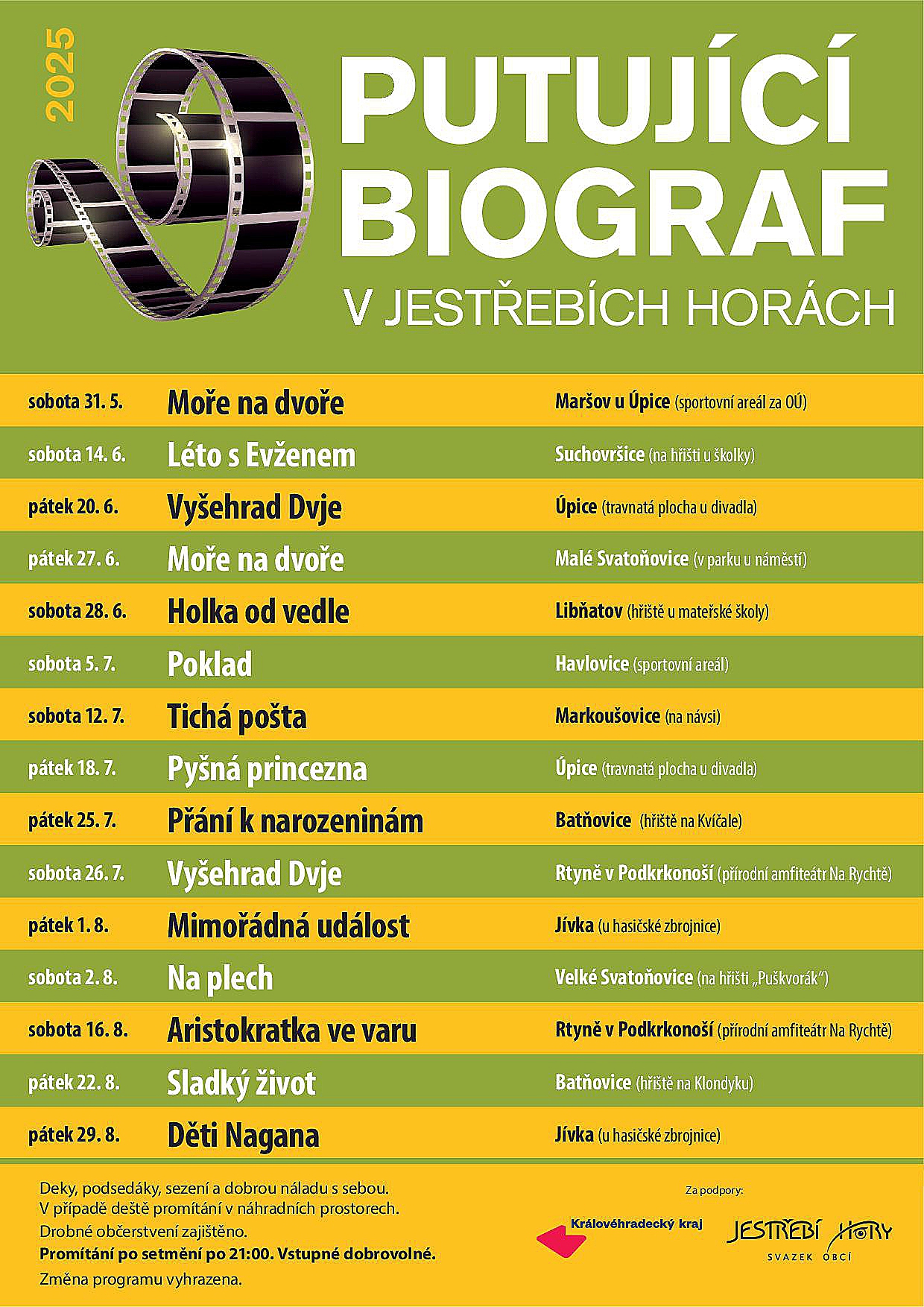 I letošní léto 2025 bude v našem regionu ve znamení Putujícího biografu. Obce z Jestřebích hor si pro vás opět připravily oblíbené večerní promítání v přírodě. Tak neváhejte a přijďte se bavit!