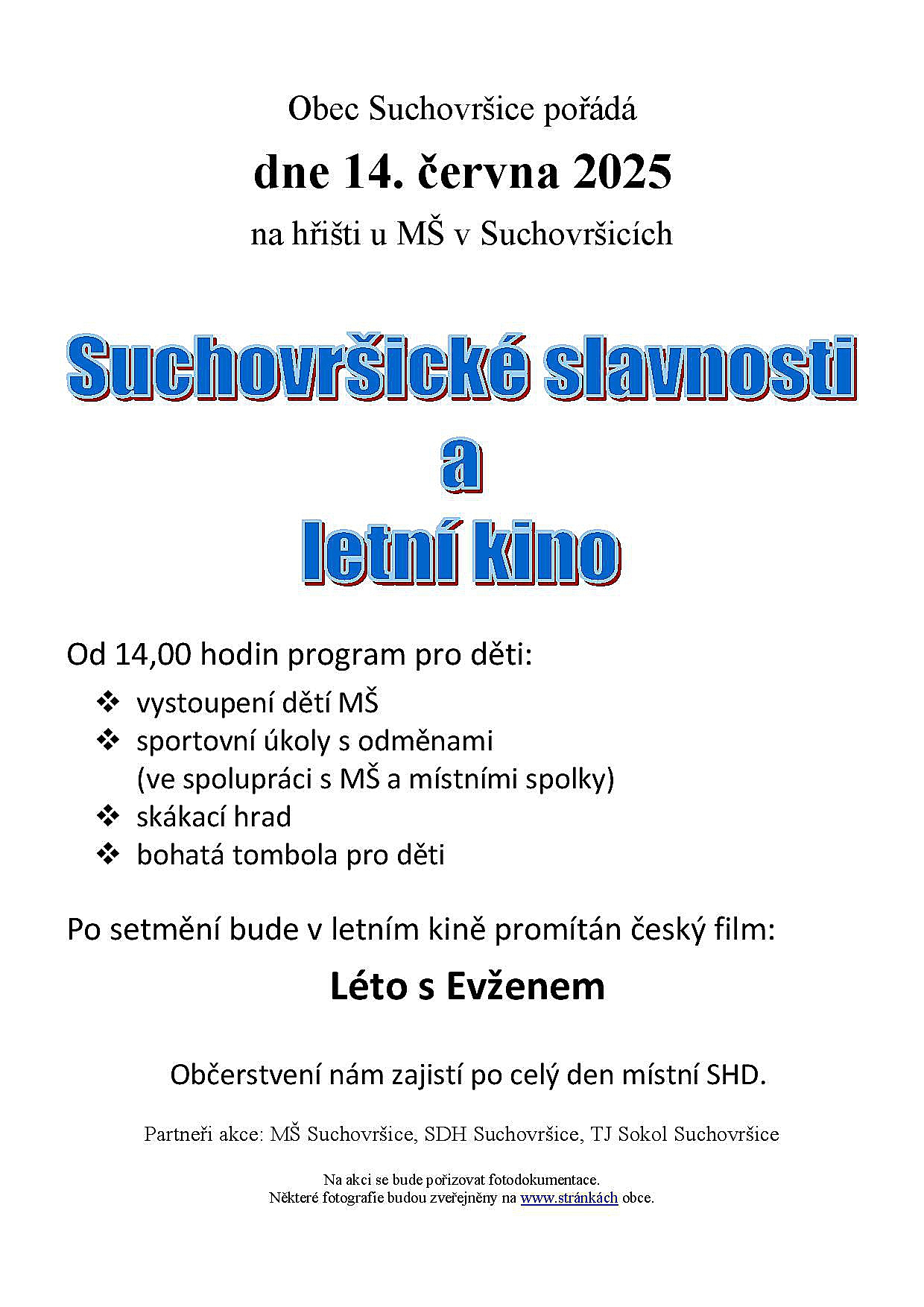 Obec Suchovršice zve 14. 6. 2025 na hřiště u MŠ na Suchovršické slavnosti.