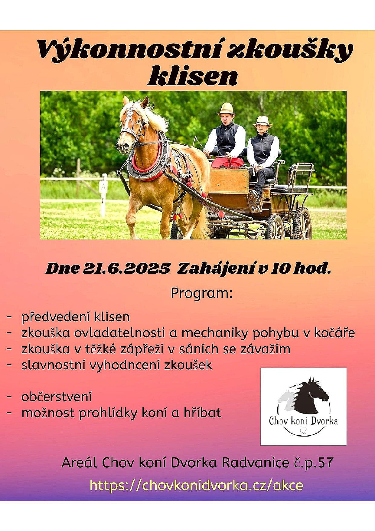 Srdečně vás zveme na výkonnostní zkoušky klisen, které se budou konat v areálu chovu koní Dvorka v Radvanicích.