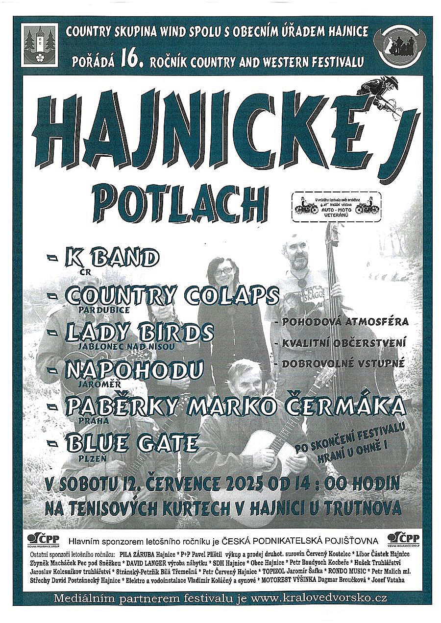 Obec Hajnice a country skupina Wind zve na 16. ročník festivalu Hajnickej Potlach, který se bude konat 12. 7. 2025 od 14:00 v přírodním areálu tenisových kurtů v Hajnici.