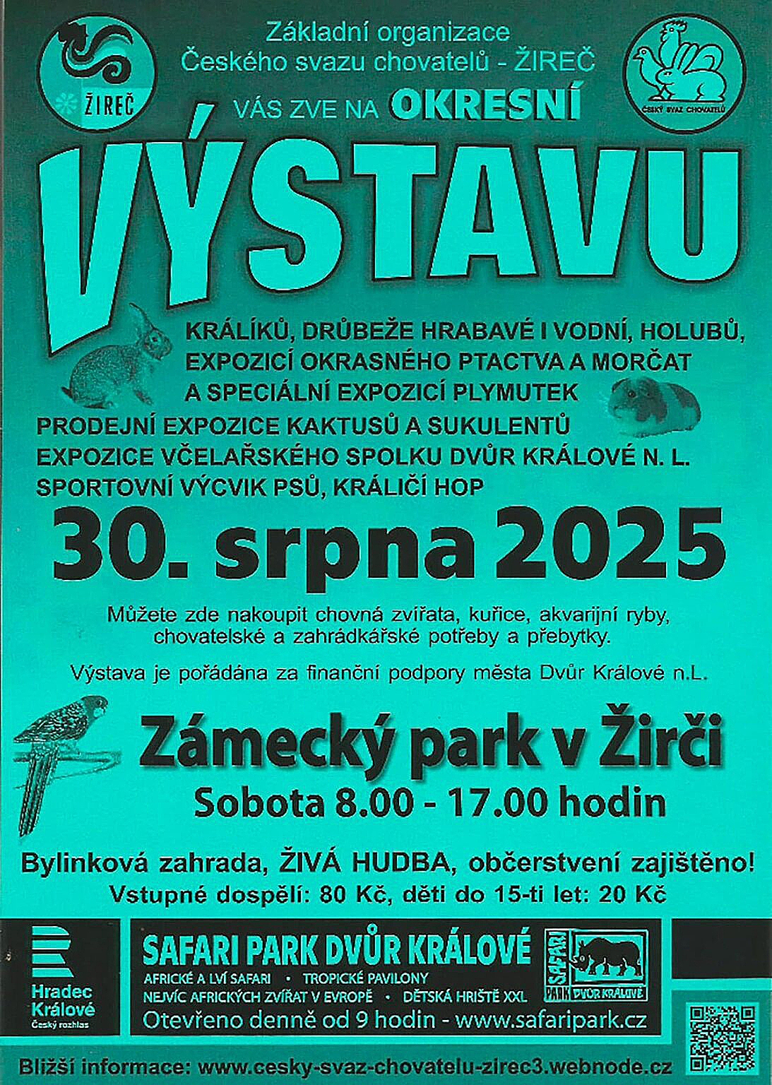 Máme pro vás pozvánku na tradiční okresní chovatelskou výstavu, která se uskuteční v sobotu 30. 8. 2025 od 8:00 do 17:00 hodin v malebném prostředí zámeckého parku v Žirči u Dvora Králové nad Labem.
