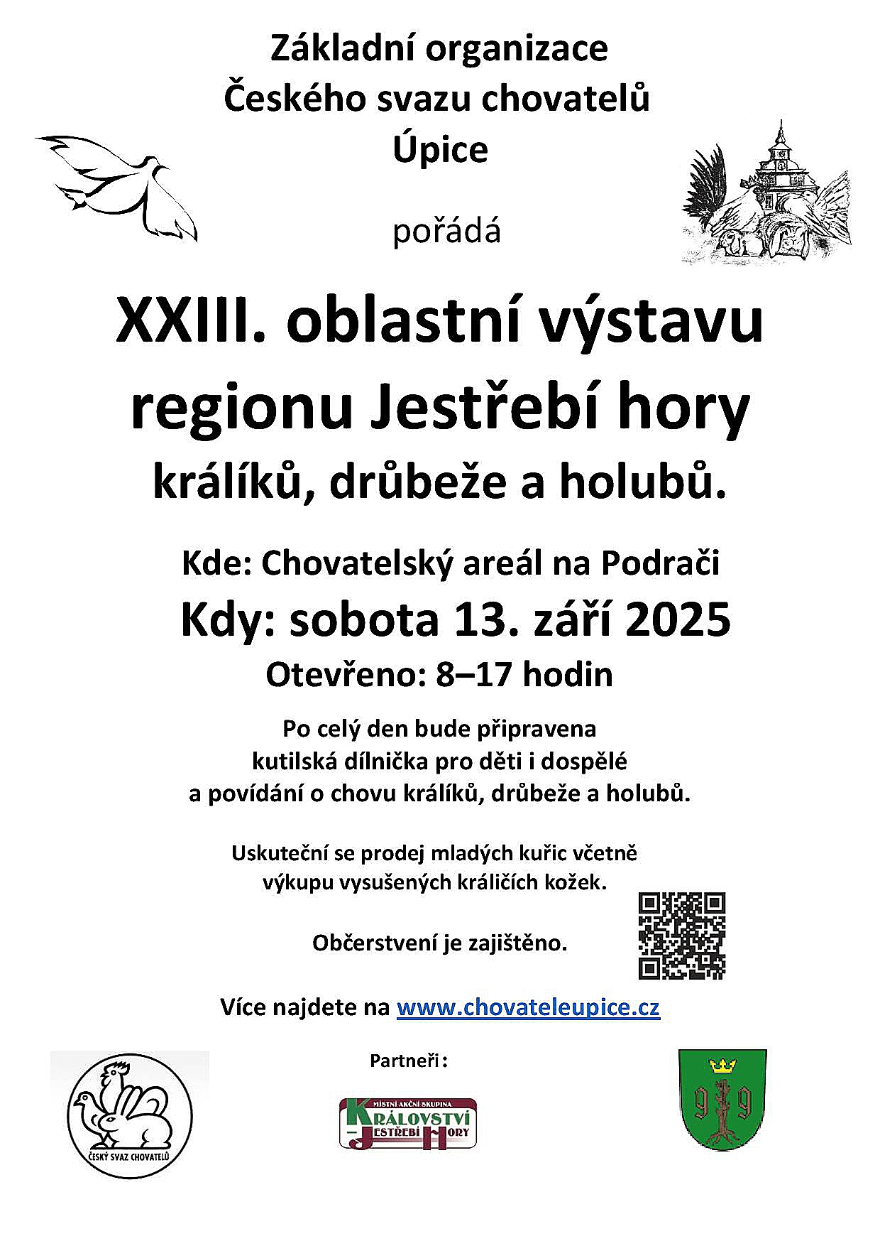 Akce se uskuteční v sobotu 13. 9. 2025 od 8:00 do 17:00 hodin v chovatelském areálu na Podrači v Úpici.