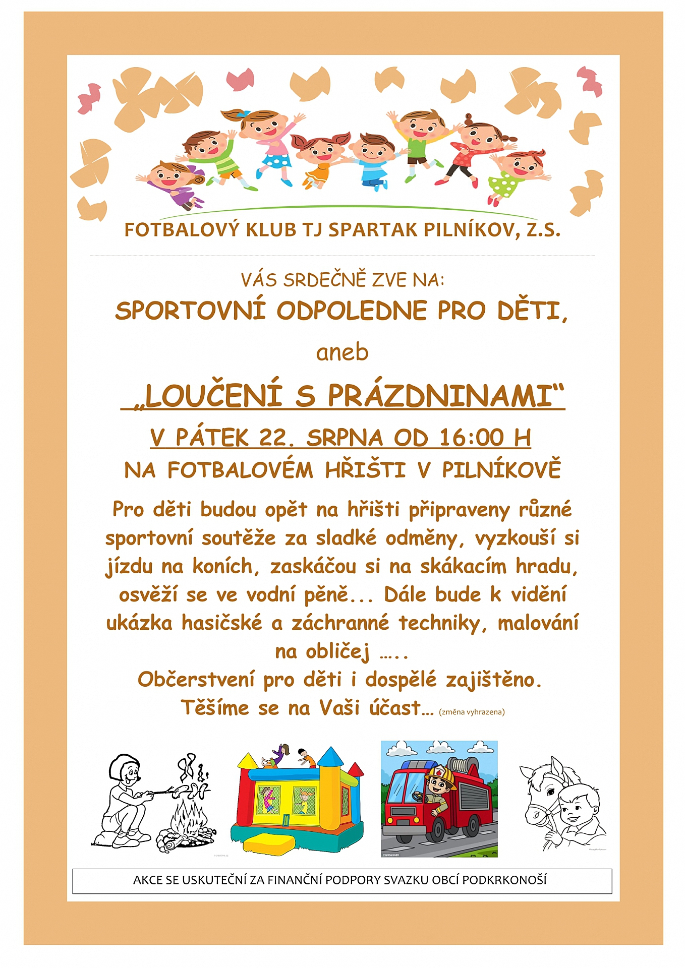 Léto se pomalu chýlí ke konci, a tak vás srdečně zveme na tradiční Loučení s prázdninami, které se uskuteční na fotbalovém hřišti v Pilníkově!