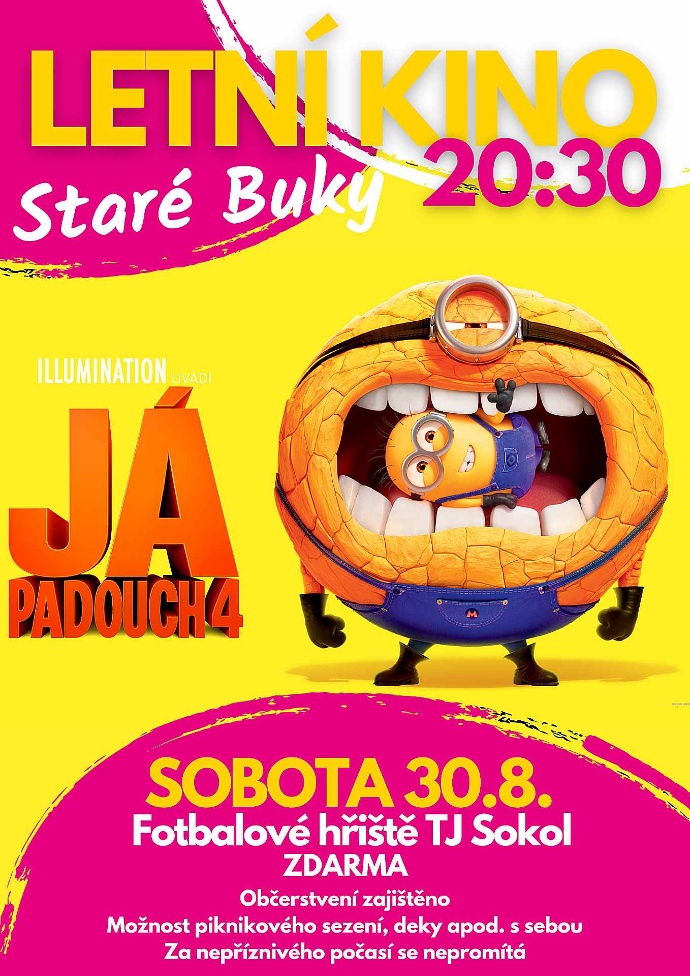 Promítání proběhne po setmění na fotbalovém hřišti, občerstvení bude zajištěno. Nezapomeňte deky, karimatky nebo lehátka – ať je vám pohodlně.