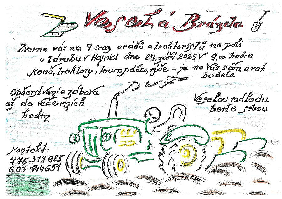 V sobotu 27. 9. 2025 od 9:00 hod. se koná sraz oráčů a traktoristů na poli v Hajnici u Zárubů.