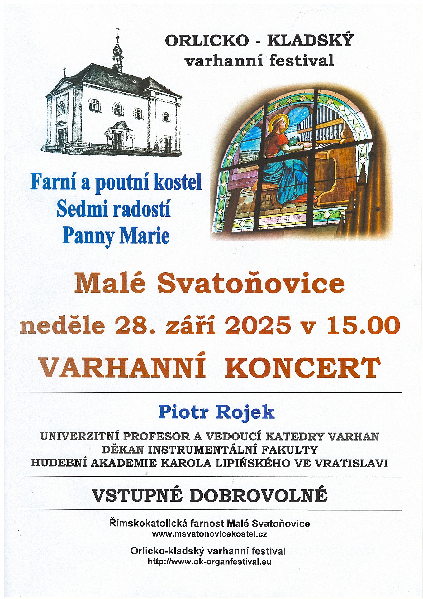 Srdečně vás zveme na výjimečný hudební zážitek v krásném prostředí poutního kostela v Malých Svatoňovicích. Přijďte si vychutnat varhanní hudbu v podání špičkových interpretů v rámci prestižního Orlicko-kladského varhanního festivalu.