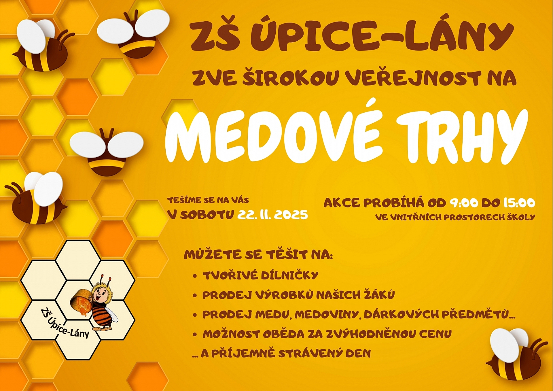 Základní škola Úpice-Lány nás zve na Medové trhy. Akce pro širokou veřejnost se v prostorách školy uskuteční v sobotu 22. listopadu 2025 mezi 9. a 15. hodinou.