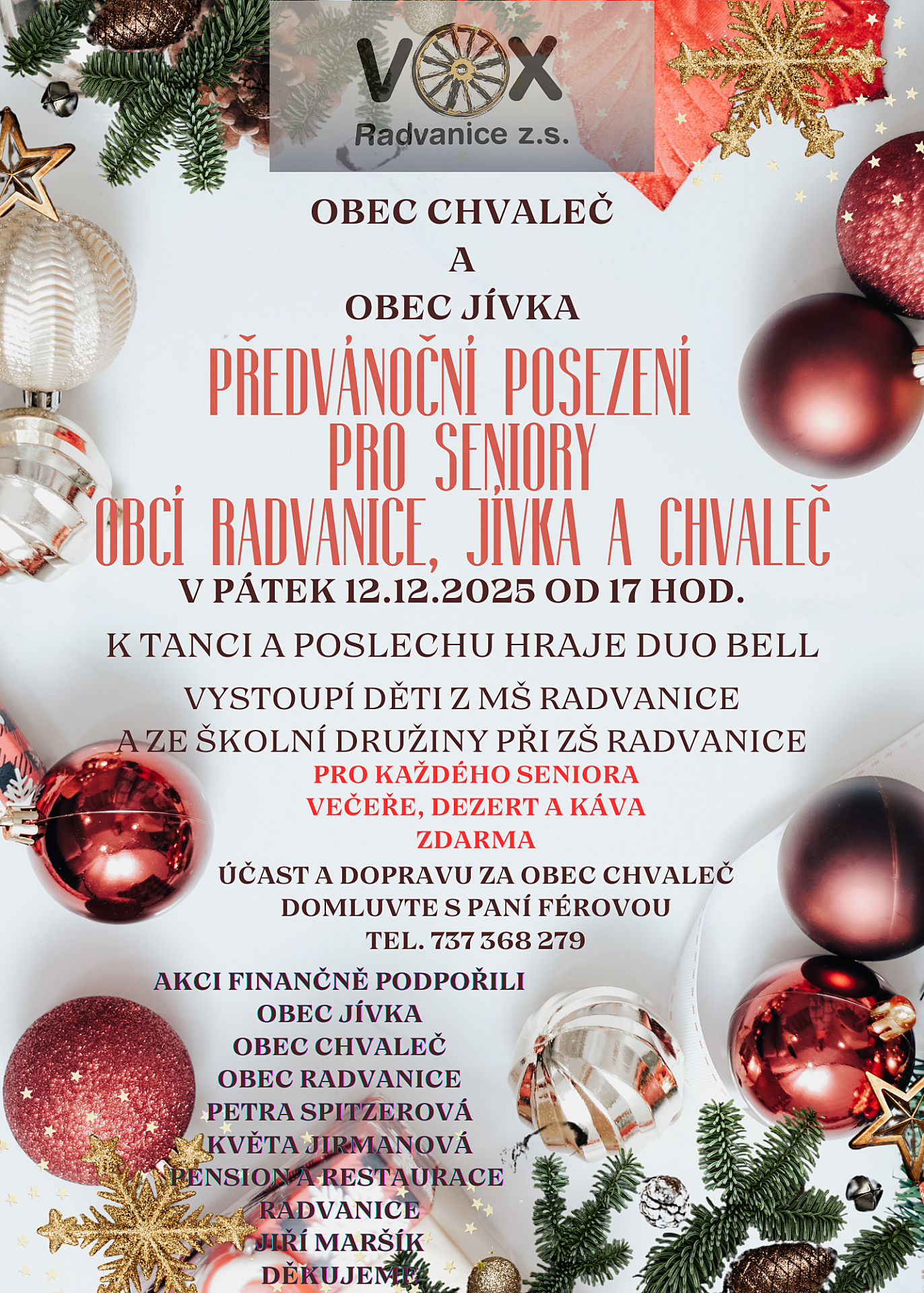 Pension Radvanice bude v pátek 12. prosince 2025 od 17 hodin hostit Předvánoční posezení pro seniory obcí Radvanice, Jívka a Chvaleč.