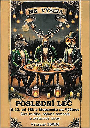 Myslivecký spolek Výšinka srdečně zve všechny členy, přátele i příznivce myslivosti na Poslední leč, která se uskuteční 6. 12. 2025 od 18 hodin v Motorestu na Výšince.