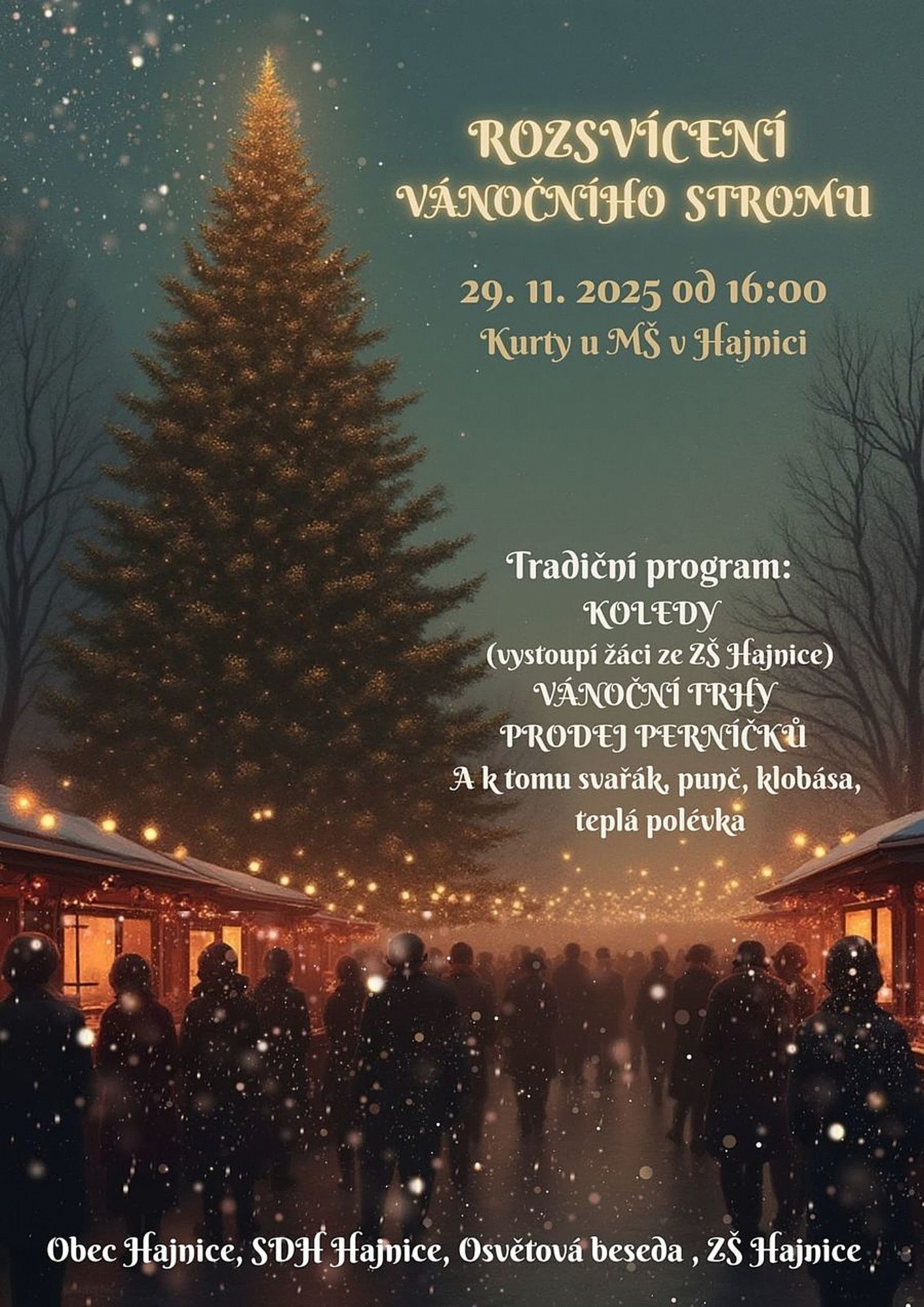 Hajnice vás srdečně zve na tradiční rozsvícení vánočního stromu, které se uskuteční 29. 11. 2025.