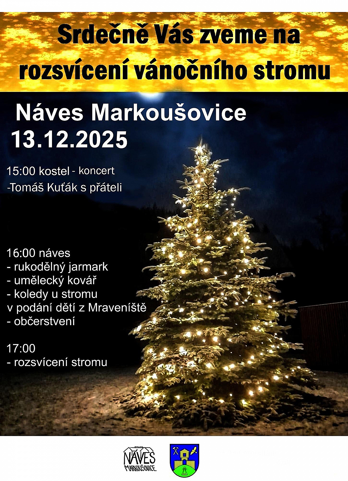 Srdečně zveme všechny obyvatele i návštěvníky na slavnostní rozsvícení vánočního stromu na návsi v Markoušovicích.