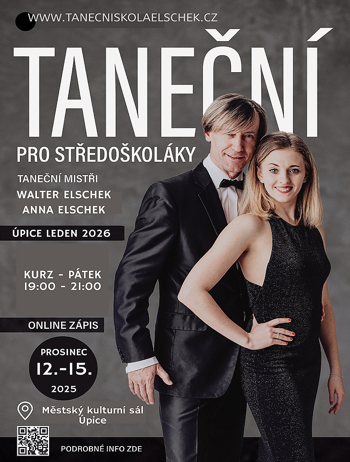 Taneční mistr pan Elschek s partnerkou Annou pořádá taneční kurz pro mládež v Úpici.