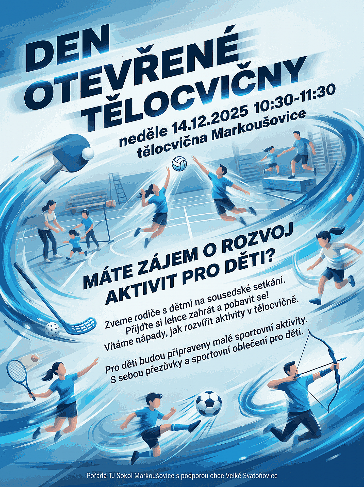 TJ Sokol Markoušovice zve všechny občany na Den otevřené tělocvičny, který se uskuteční v neděli 14. 12. 2025 od 10:30 do 11:30 hod v tělocvičně v Markoušovicích.