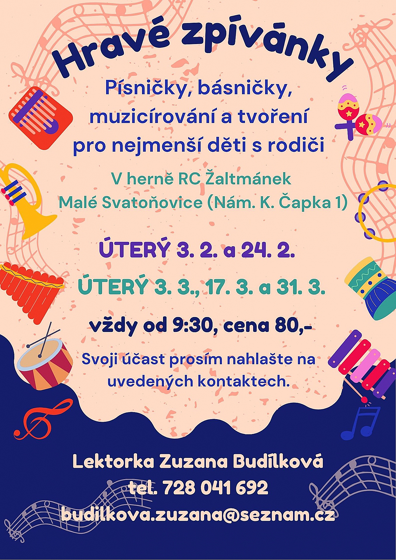 Písničky, básničky, muzicírování a tvoření pro nejmenší děti s rodiči v herně RC Žaltmánek, Malé Svatoňovice (nám. K. Čapka 1).