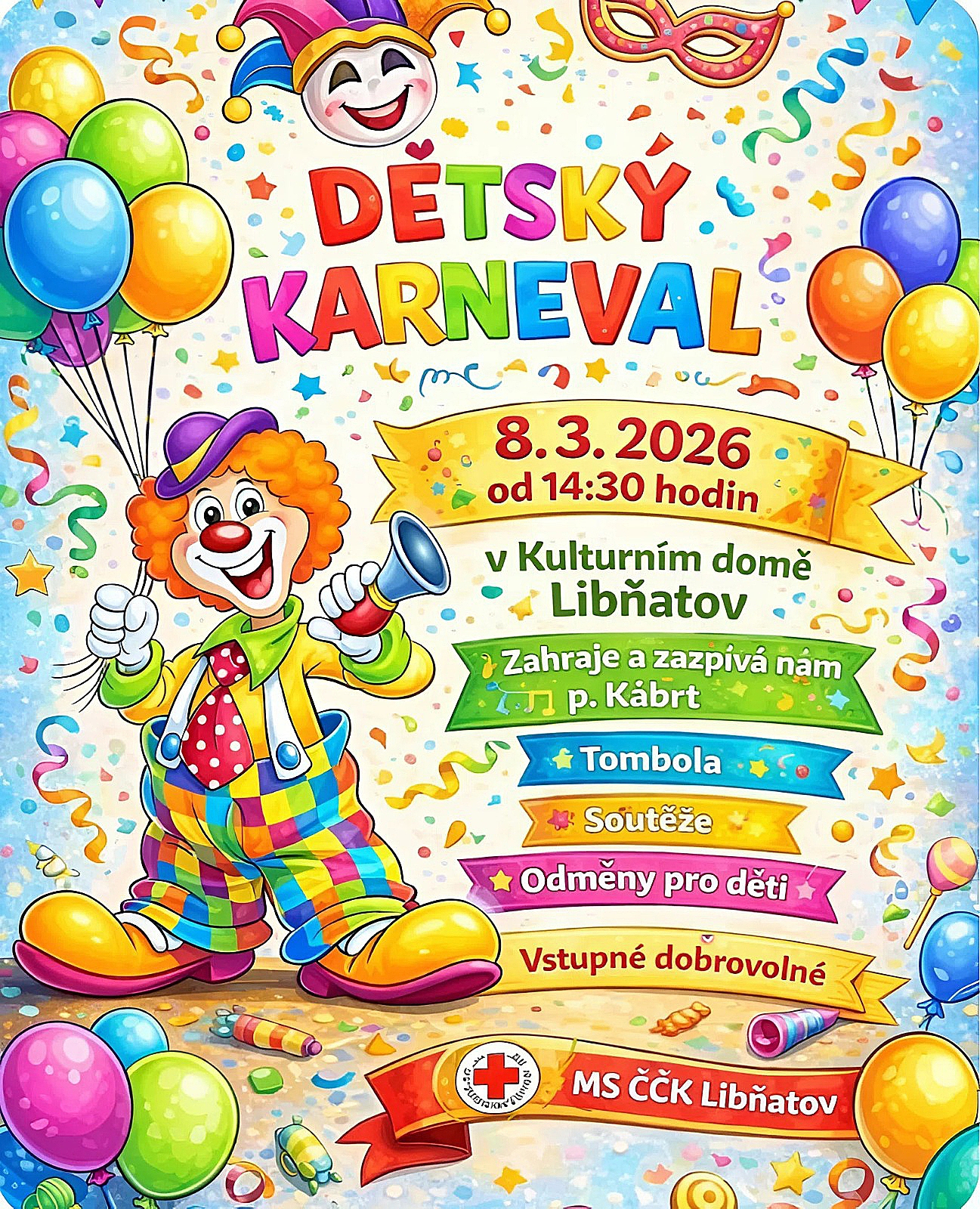 Místní skupina Českého červeného kříže Libňatov zve všechny děti i rodiče na tradiční Dětský karneval, který se uskuteční v neděli 8. března 2026. Zábavné odpoledne plné masek a hudby vypukne ve 14:30 hodin v prostorách Kulturního domu v Libňatově.