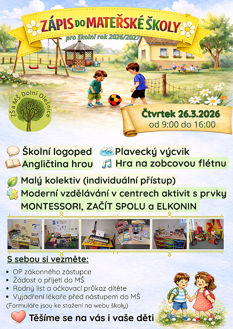 ZŠ a MŠ Dolní Olešnice zve všechny rodiče a budoucí školkáčky k zápisu do mateřské školy pro školní rok 2026/2027.