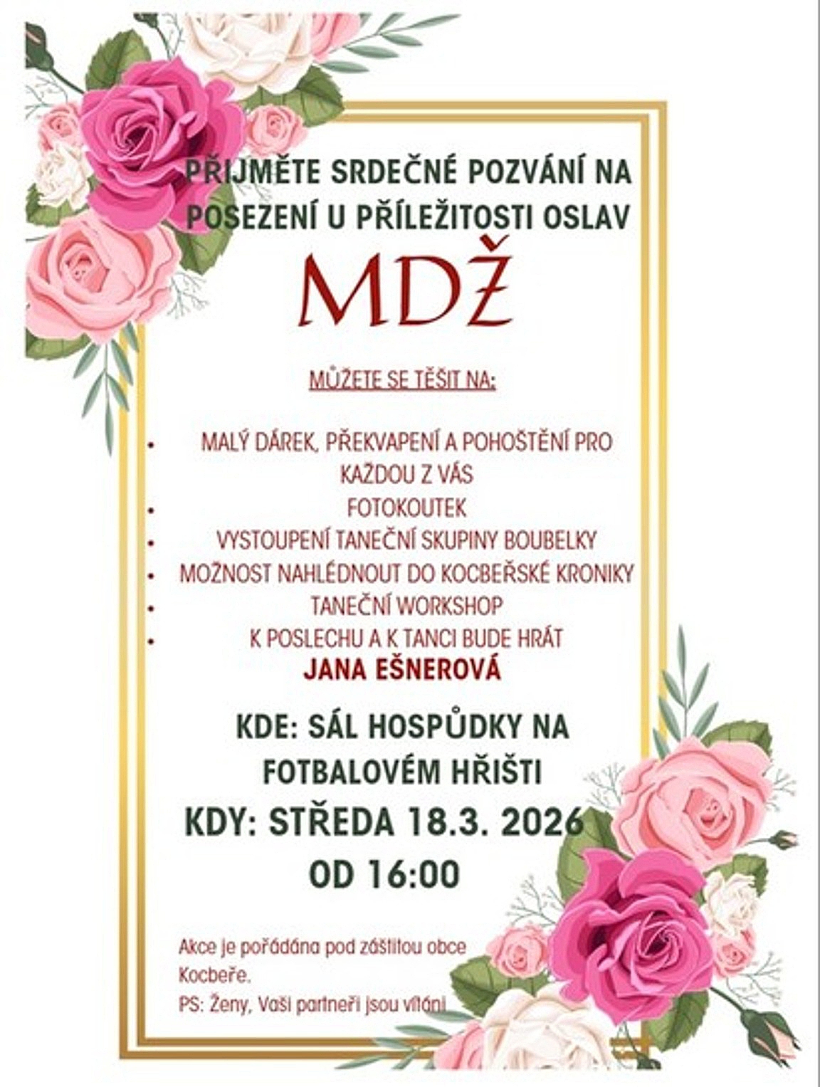 Milé dámy, sousedky, kamarádky, srdečně vás zveme na společné posezení u příležitosti oslav MDŽ, které se uskuteční v březnu v naší obci. Přijďte si odpočinout od každodenních starostí, pobavit se a užít si odpoledne plné úsměvů.