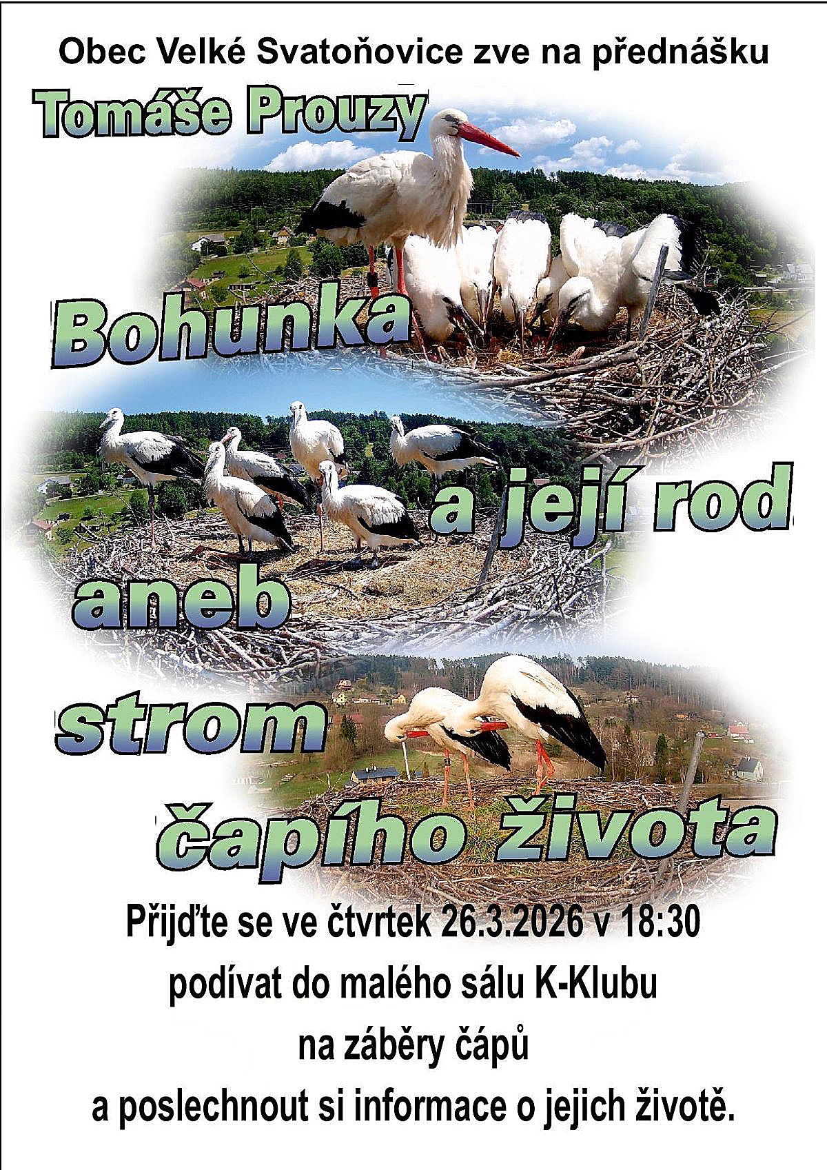 Zveme všechny obyvatele obce na přednášku Tomáše Prouzy, která se uskuteční ve čtvrtek 26. března 2026 od 18:30 hodin v malém sále K Klubu ve Velkých Svatoňovicích.