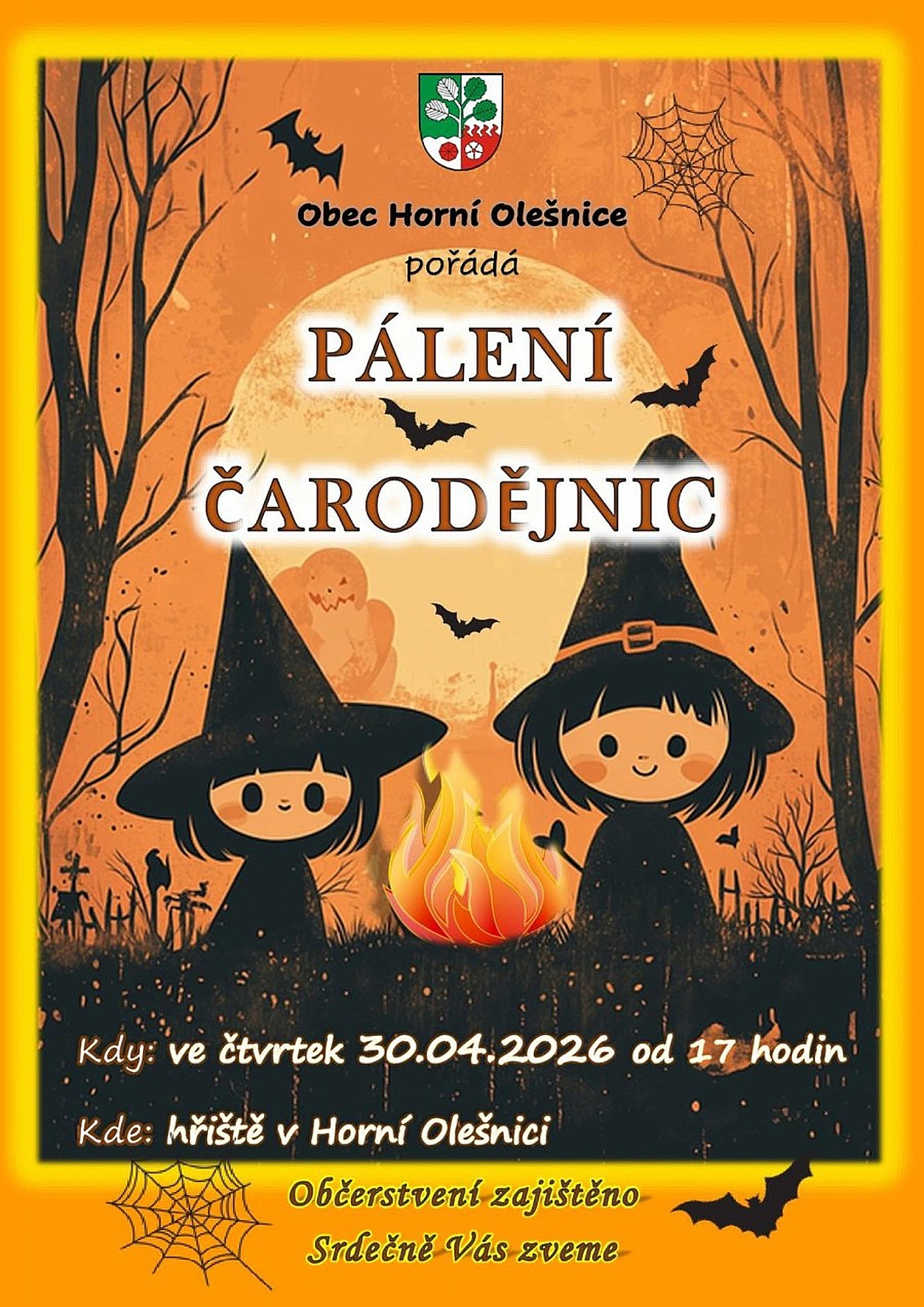 Srdečně zveme všechny občany a přátele na tradiční Pálení čarodějnic, které se uskuteční 30. dubna od 18:00 v Horní Olešnici.