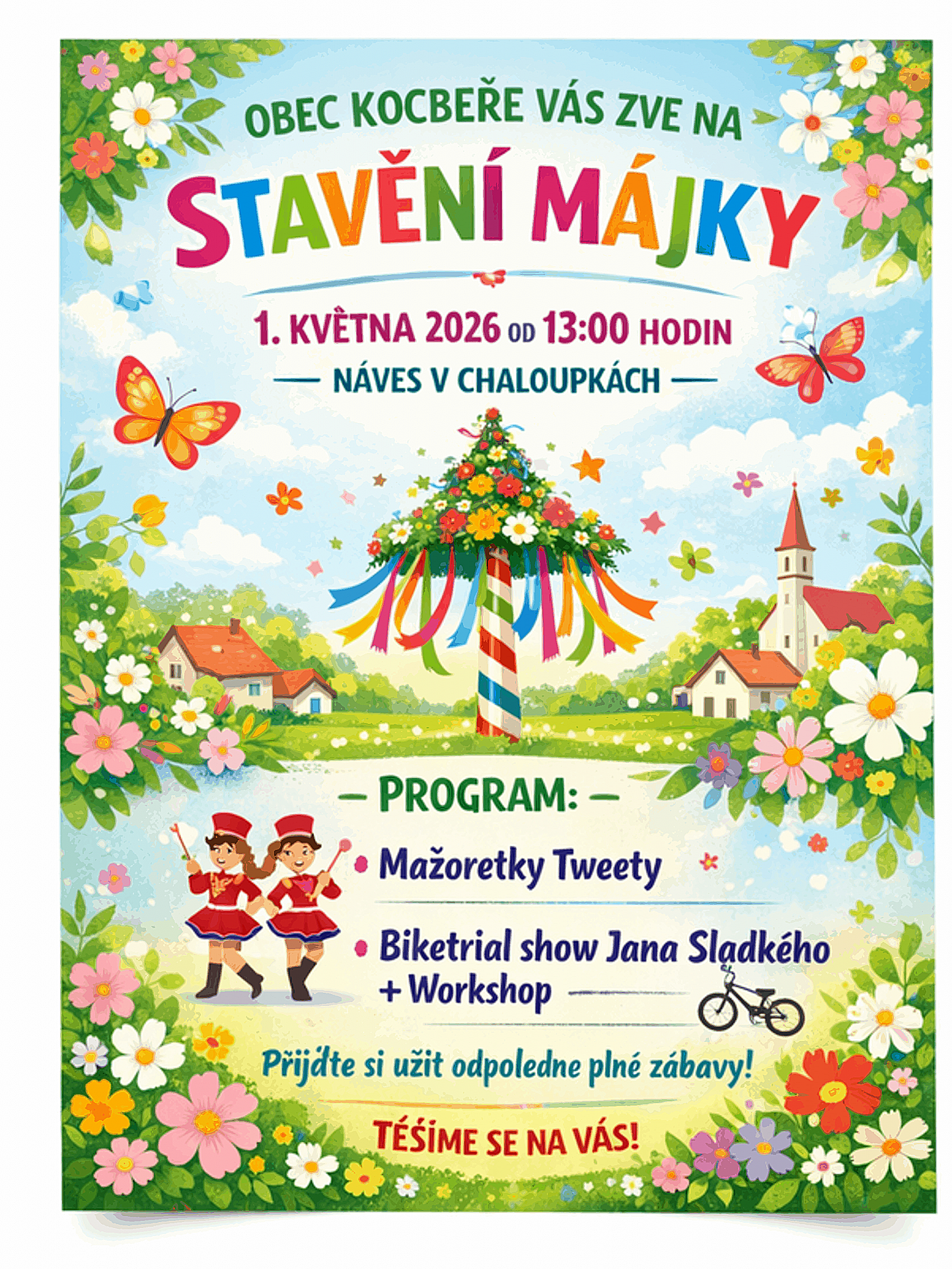 Obec Kocbeře srdečně zve všechny sousedy, přespolní i rodiny s dětmi na tradiční Stavění májky, které se uskuteční v pátek 1. května 2026. Akce vypukne ve 13:00 hodin na návsi v Chaloupkách.