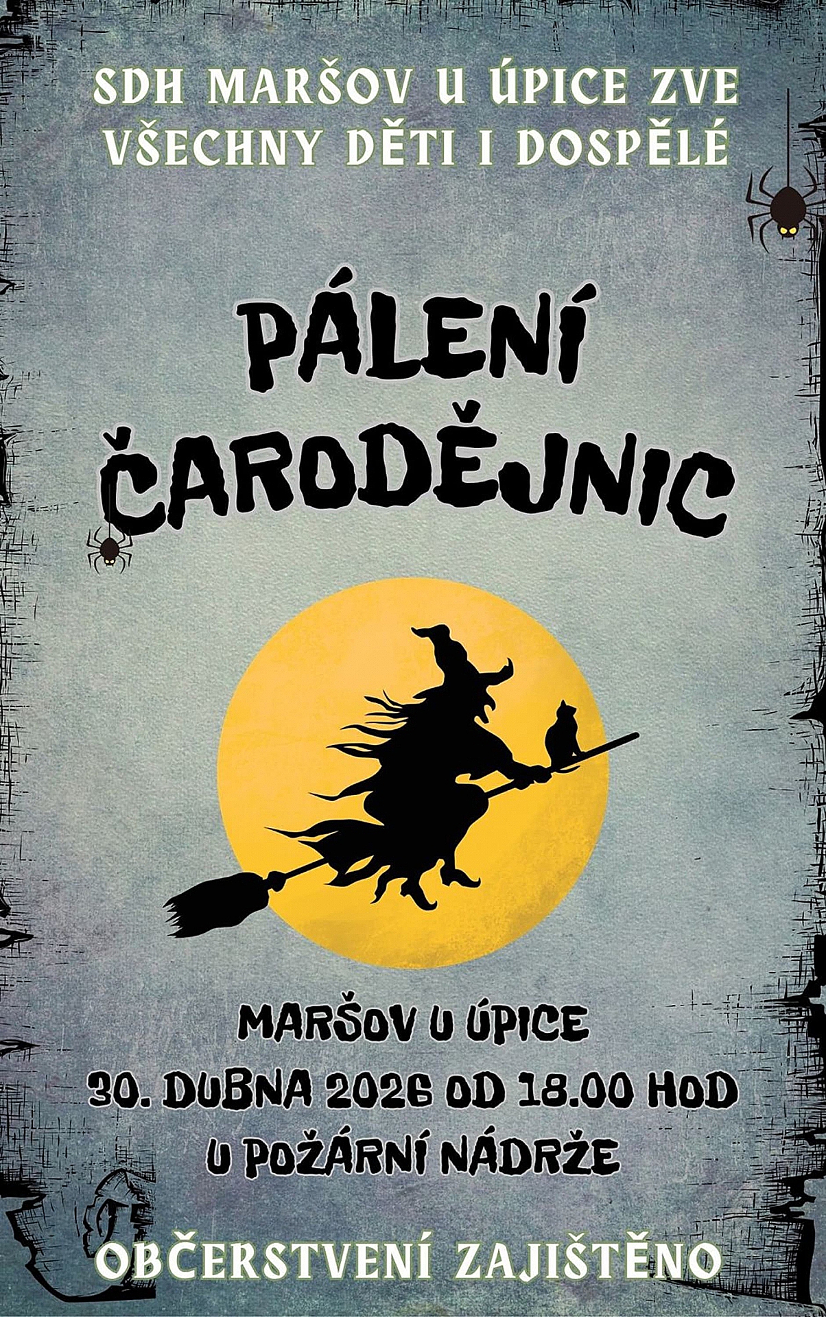 Sbor dobrovolných hasičů z Maršova srdečně zve malé i velké na tradiční pálení čarodějnic. Ve čtvrtek 30. 4. 2026 od 18:00 ožije opět areál u požární nádrže.