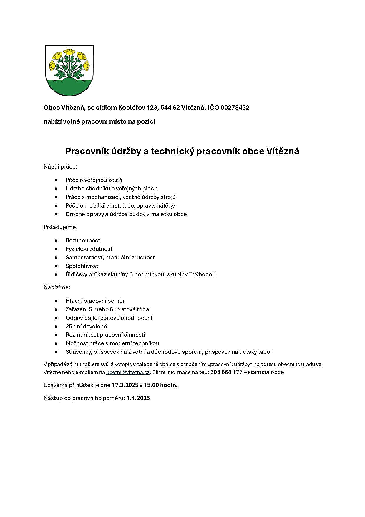 Bližší informace na e-mailu ucetni@vitezna.cz nebo na tel. 603 868 177.