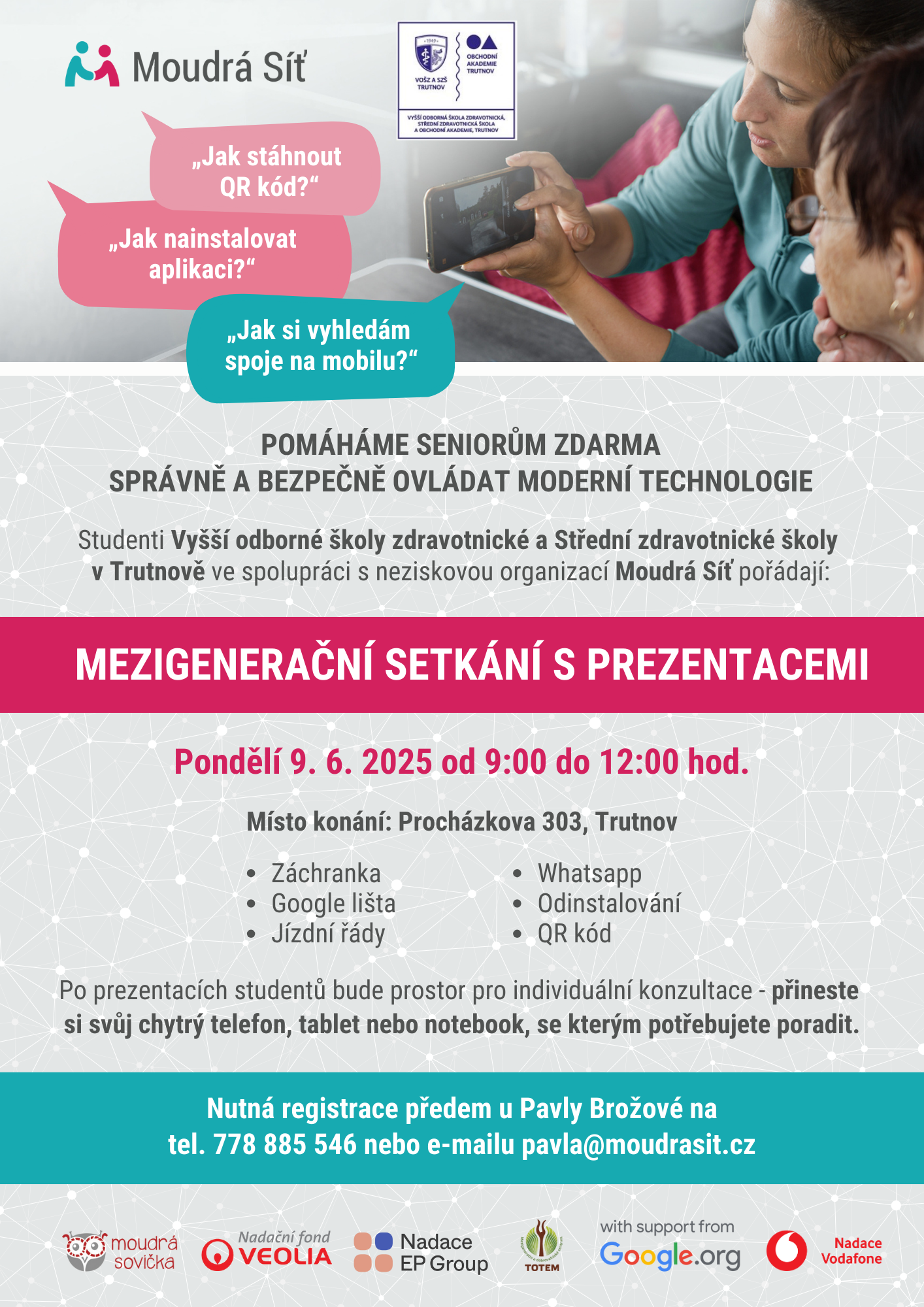 V pondělí 09.06.2025 od 9:00 do 12:00 studenti Vyšší odborné školy zdravotnické a Střední zdravotnické školy v Trutnově ve spolupráci s neziskovou organizací pořádají Mezigenerační setkání s prezentacemi. Studenti se budou věnovat tématu, jak správně a bezpečně ovládat moderní technologie (např. aplikace Záchranka, QR kód apod.). Nutná registrace předem (tel.č.: 778 885 546 nebo e-mail: pavla@moudrasit.cz)