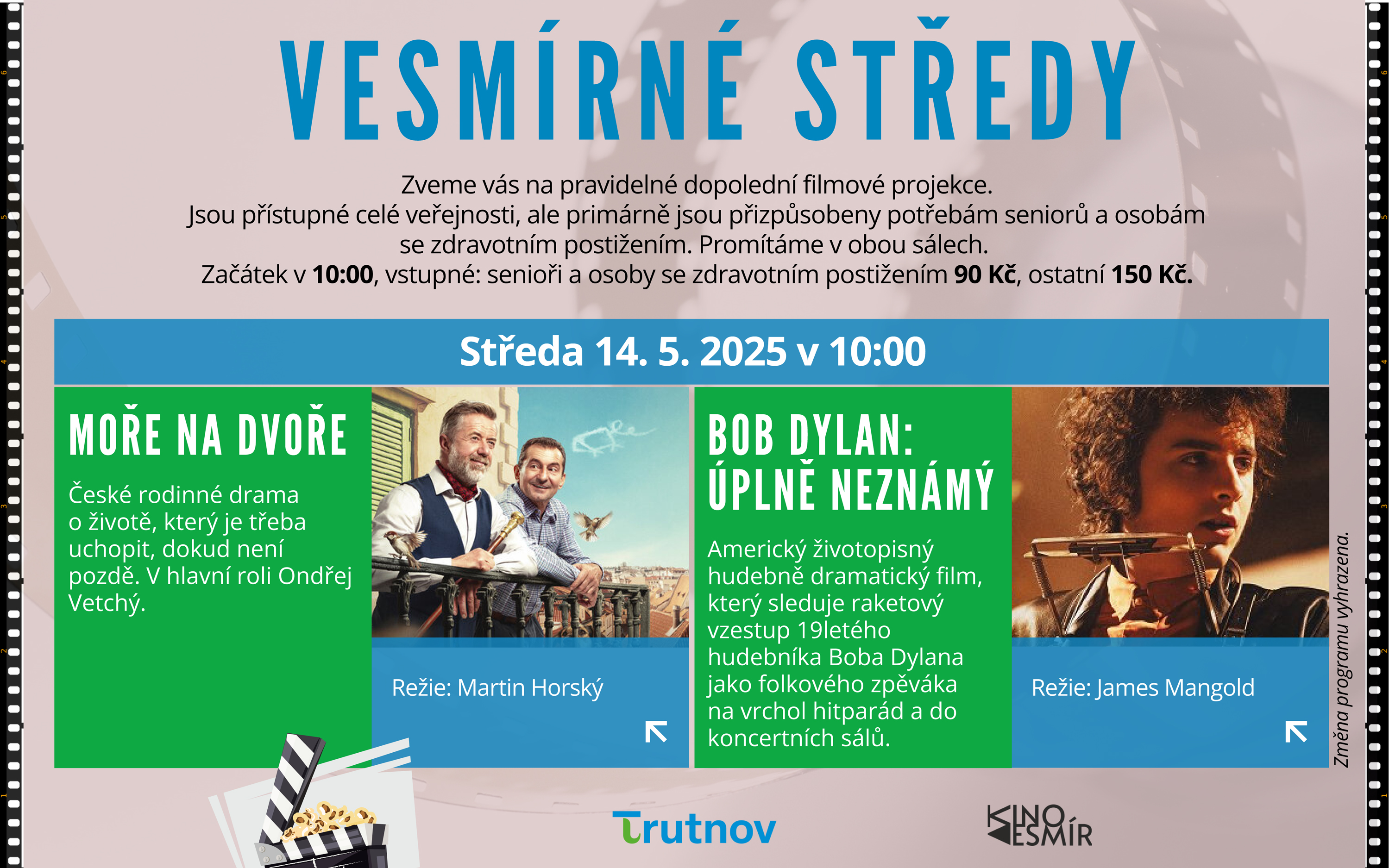 Ve středu 14.05.2025 se uskuteční promítání v rámci Vesmírných střed. Od 10 hodin se budou promítat dva tituly - Moře na dvoře a Bob Dylan: úplně neznámý. Vstupné pro seniory a osoby se zdravotním postižením 90 Kč, ostatní 150 Kč.