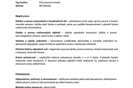 Opravy poruch, odečty vodoměrů, obsluha ČOV.