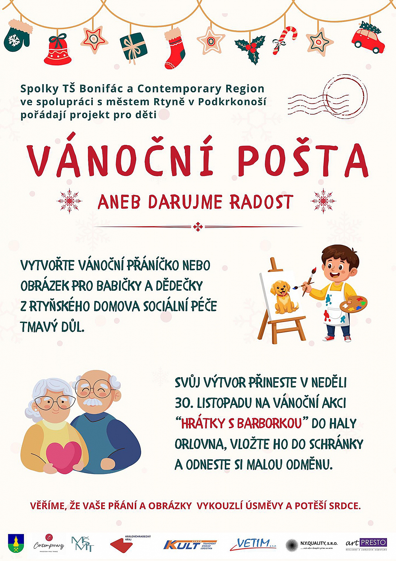 Přáníčka, která vytvoříte doma nebo ve škole, přineste prosím na akci Hrátky s Barborkou, která proběhne 30. 11. 2025. Všechna darovaná přání společně odešleme seniorům, aby měli krásnější adventní čas.