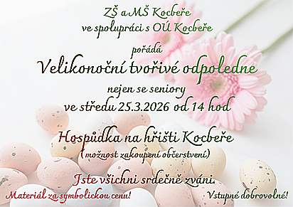 Připraveno bude vyrábění velikonočních dekorací a drobných ozdob v příjemné atmosféře. Materiál bude zajištěn.