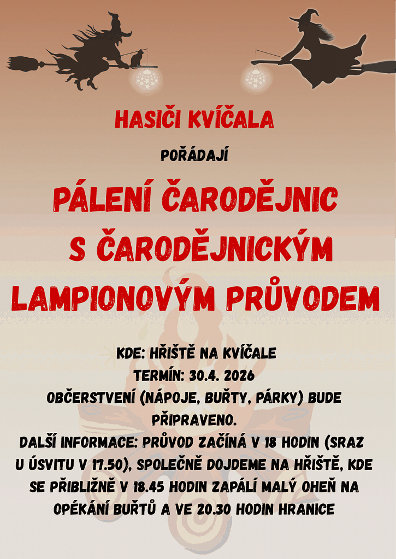 Ve středu 30. 4. 2026 od 17:45 se na Kvíčale uskuteční oblíbené pálení čarodějnic spojené s lampionovým průvodem.