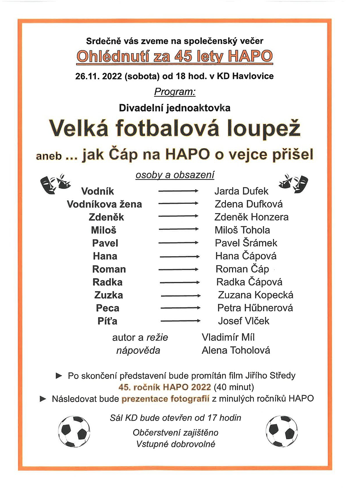 Po skončení divadelního představení bude promítán film Jiřího Středy "45. ročník HAPO 2022".