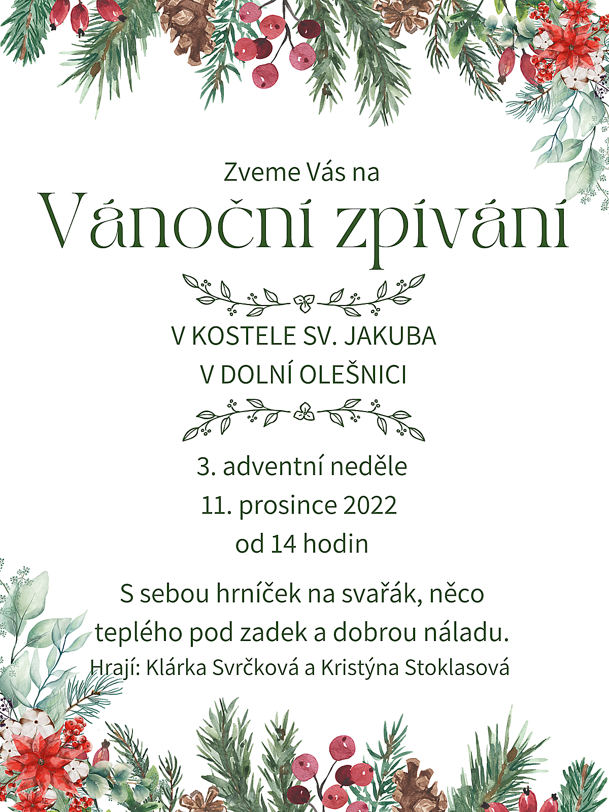 Klárka Svrčková a Kristýna Stoklasová zahrají a zazpívají v neděli 11. prosince 2022 od 14 hodin v kostele sv. Jakuba v Dolní Olešnici.