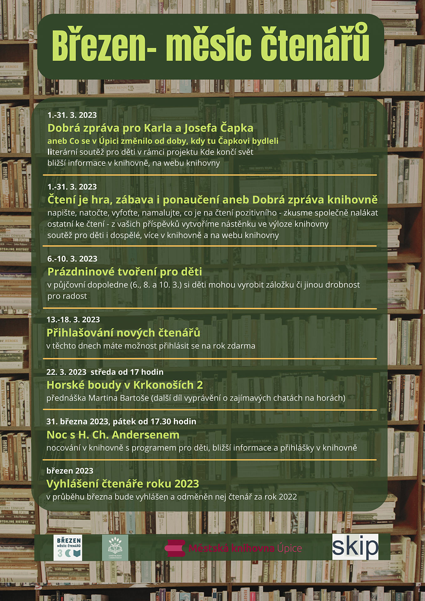 To vše a mnohem více zažijete letos v březnu v Městské knihovně v Úpici. Čtěte více na www.knihovnaupice.cz.