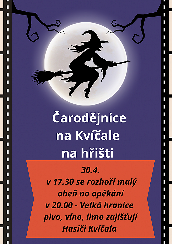 Přijďte 30. 4. 2023 na kvíčalské hřiště, kde se od 17.30 hodin rozhoří oheň k opékání buřtů a poté i velká hranice. Občerstvení zajišťují a na čarodějnice, baby jagy, kouzelníky a čaroděje se těší hasiči Kvíčala.