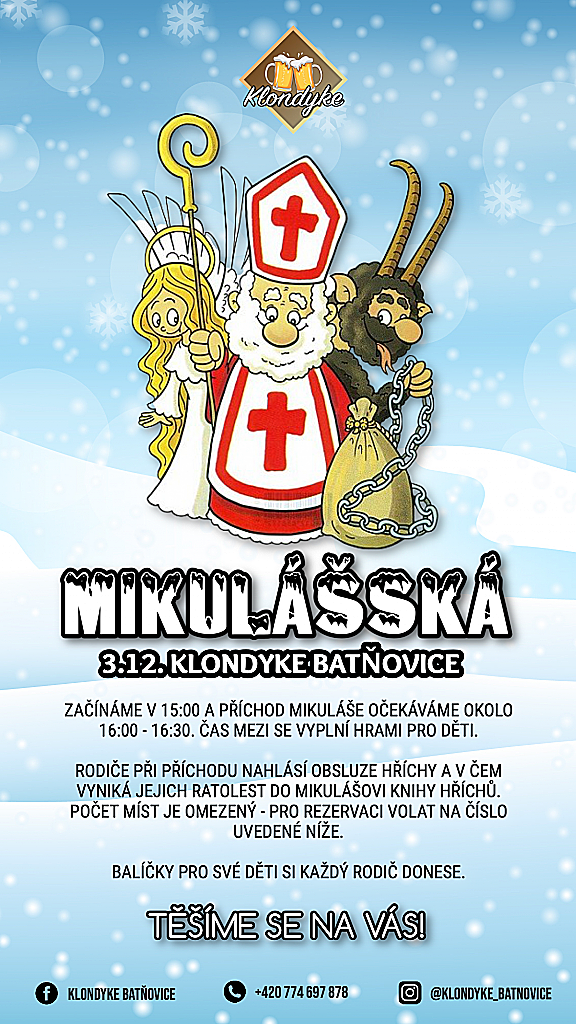 V neděli 3. prosince 2023 se na Klondyku očekává příchod Mikuláše, čerta a anděla.