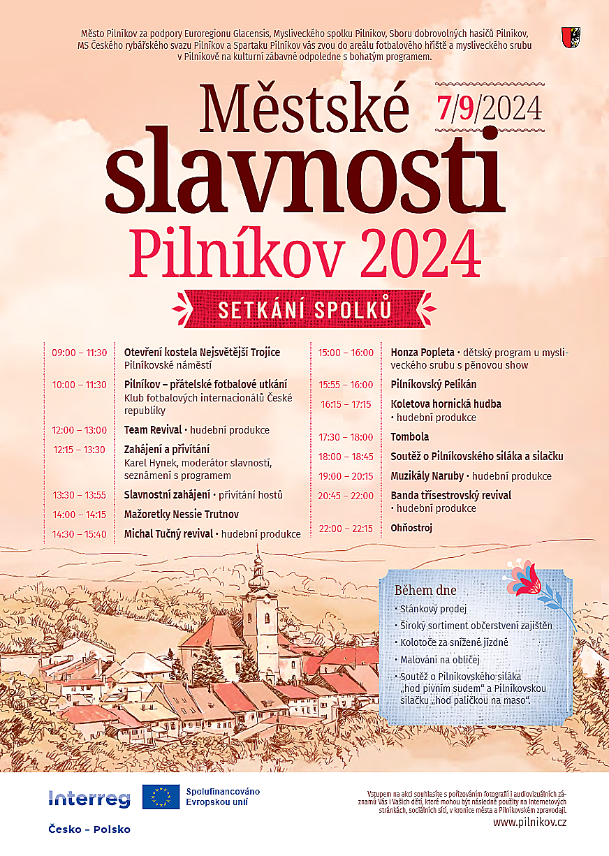 Město Pilníkov vás zve 7. 9. 2024 do areálu fotbalového hřiště, mysliveckého srubu a požární nádrže na Městské slavnosti.