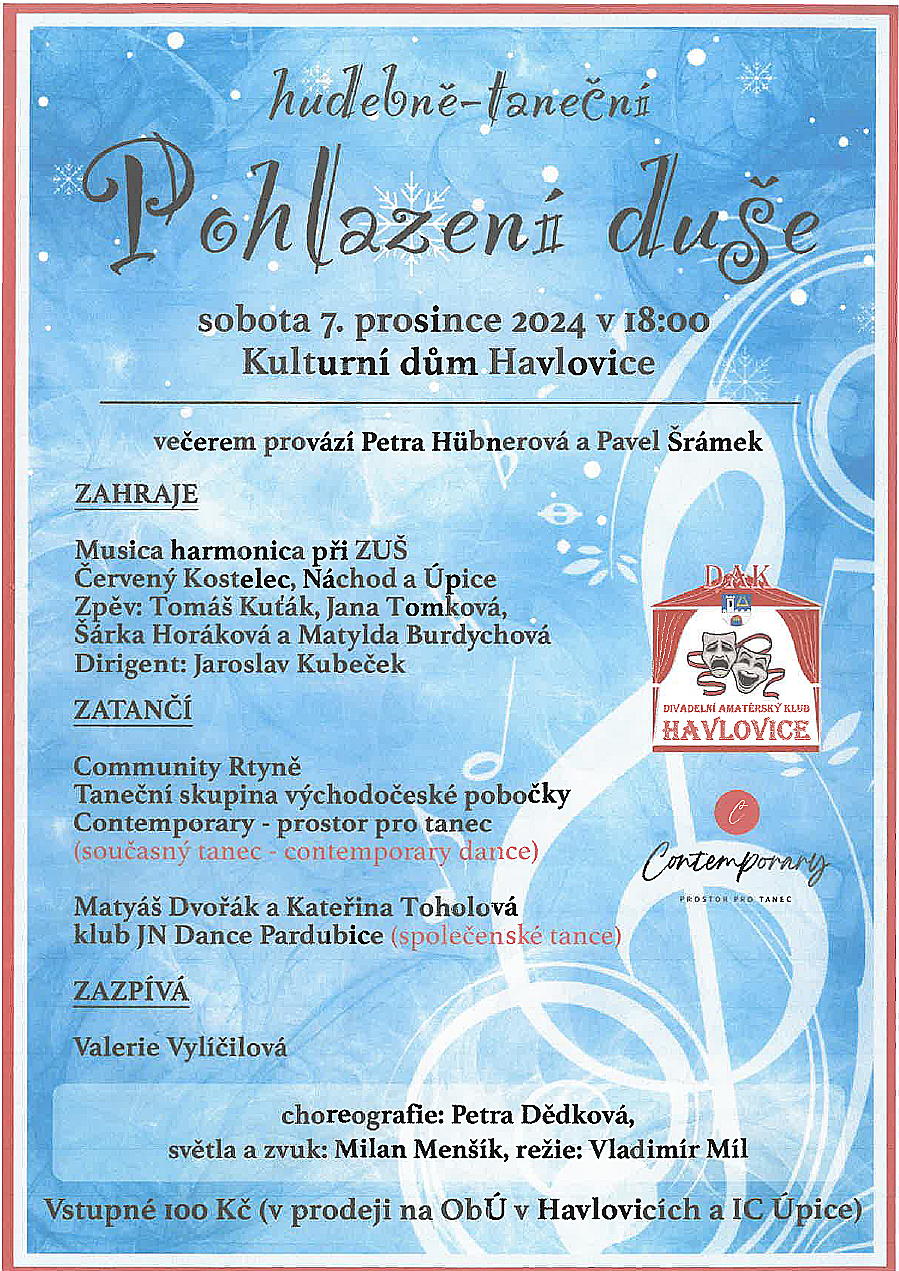 V sobotu 7. prosince 2024 se od 18:00 hodin v kulturním domě v Havlovicích koná hudebně - taneční představení Pohlazení duše.