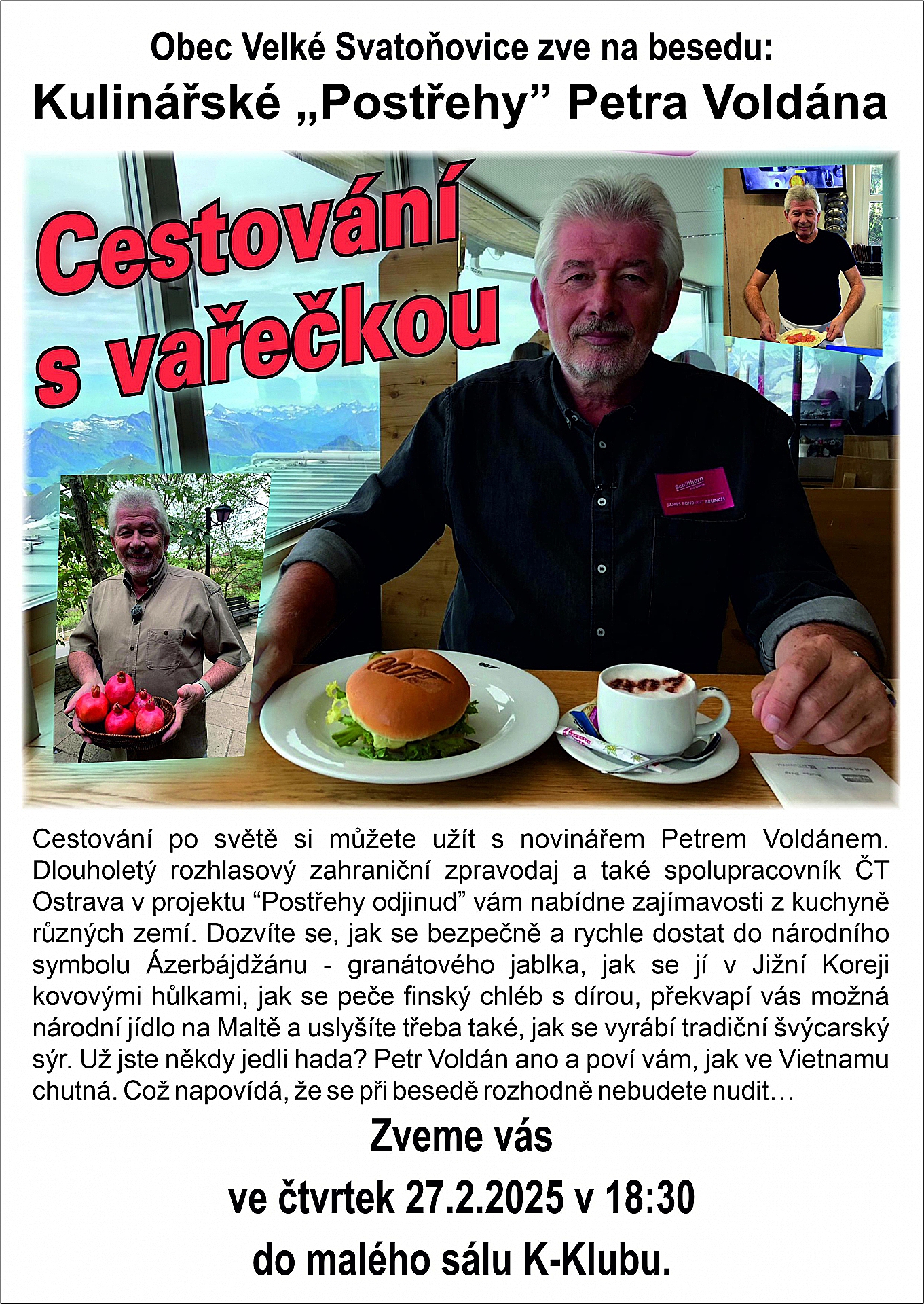 Obec Velké Svatoňovice zve na besedu: Kulinářské ,,Postřehy" Petra Voldána.