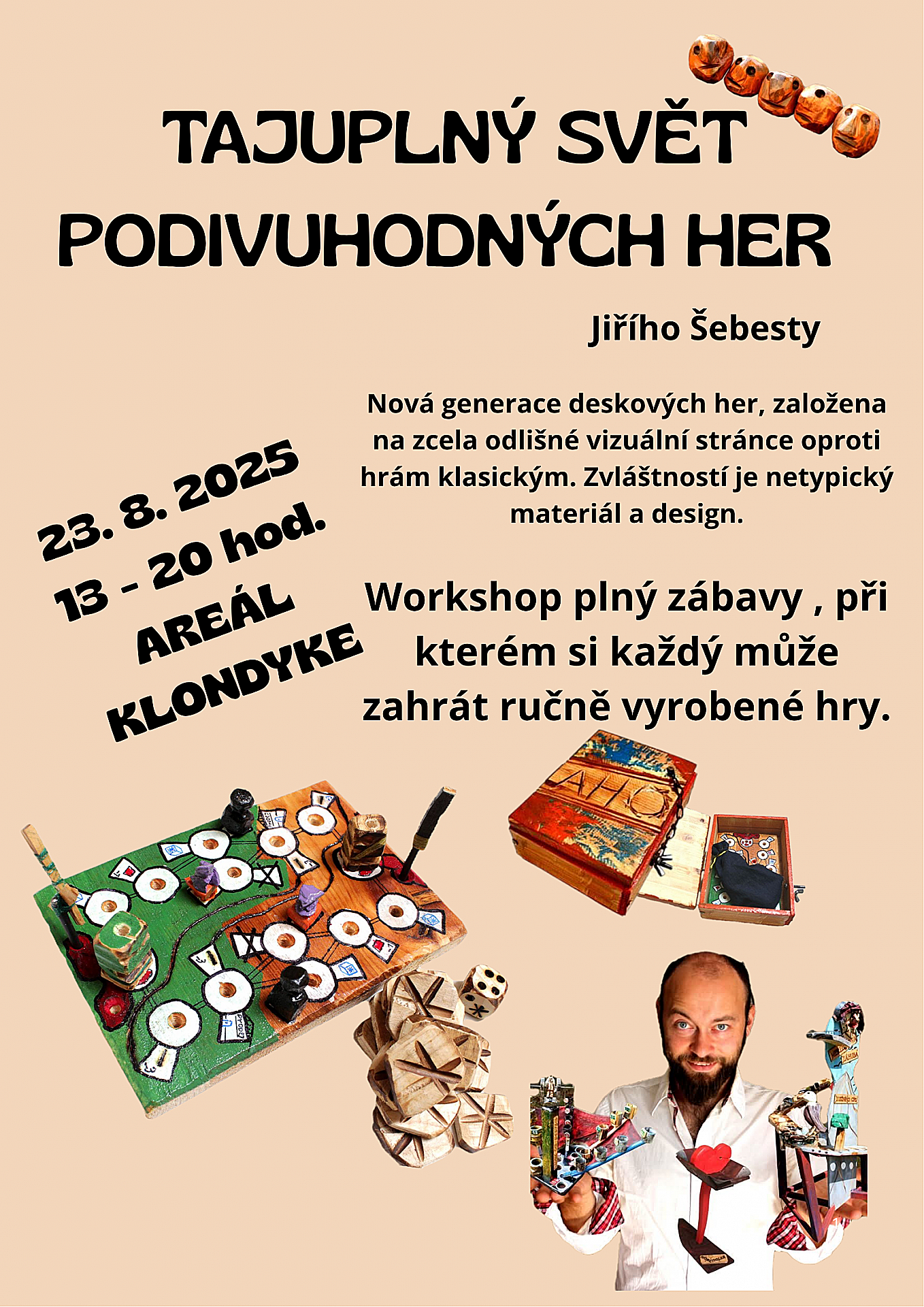 Přijďte objevit unikátní herní svět Jiřího Šebesty, který vás zavede do říše podivuhodných mechanických strojků, dřevěných hlavolamů, nečekaných hádanek a hravých vynálezů.