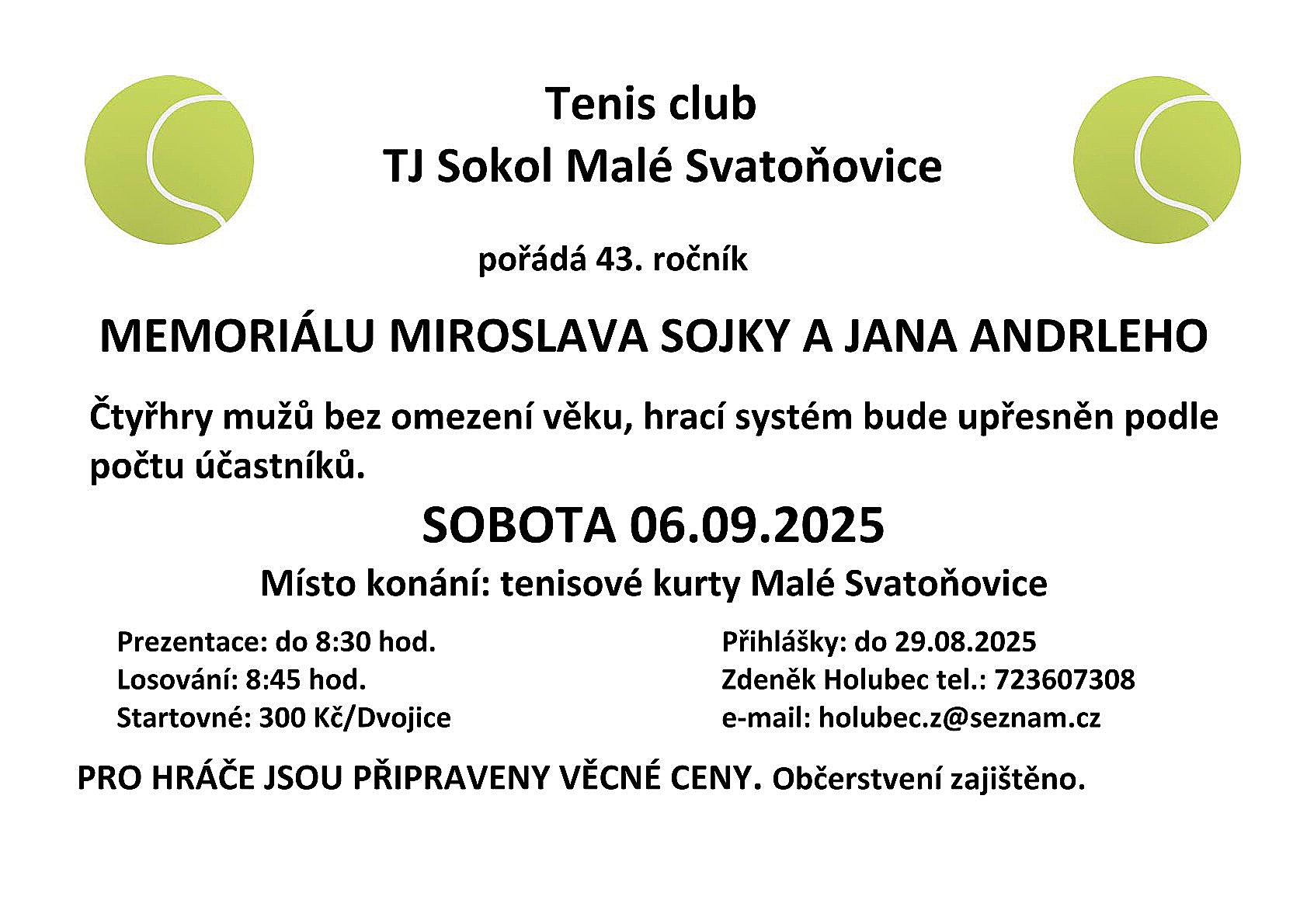 Na tenicových kurtech TJ Sokol Malé Svatoňovice se v sobotu 6. září 2025 uskuteční 43. ročník Memoriálu Miroslava Sojky a Jana Andrleho.