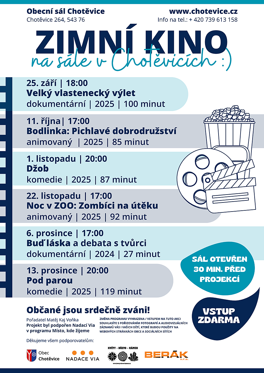 Přijďte na sál do Chotěvic na Zimní kino od 24. 9. 2025 do 13. 12. 2025. Promítání vás zahřeje nejen filmem, ale i podzimním a zimním občerstvením a příjemnou společností.