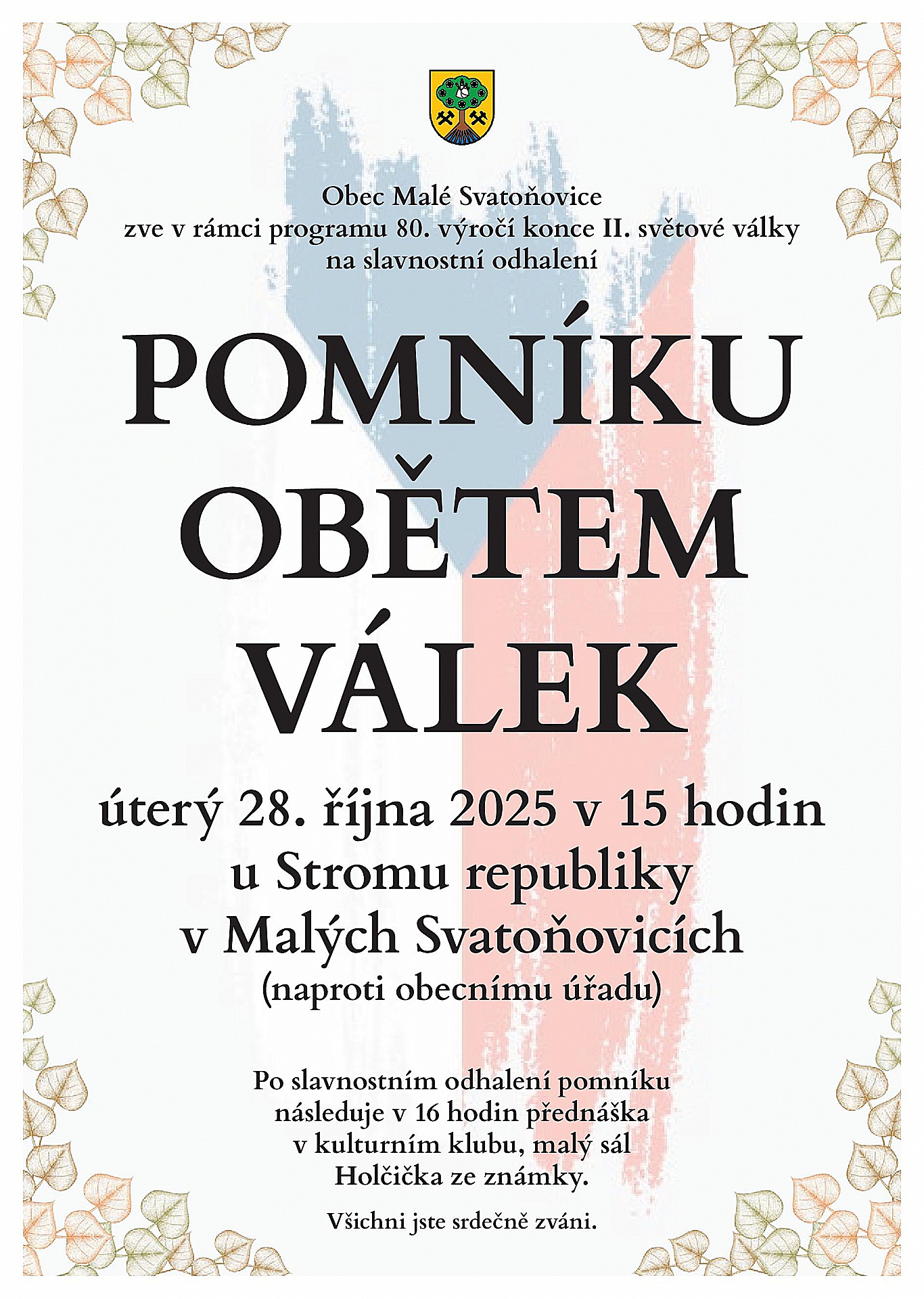 Obec Malé Svatoňovice zve v rámci programu 80. výročí konce II. světové války na slavnostní odhalení pomníku obětem válek, které se uskuteční v úterý 28. října 2025 v 15 hodin u Stromu republiky v Malých Svatoňovicích (naproti obecnímu úřadu).