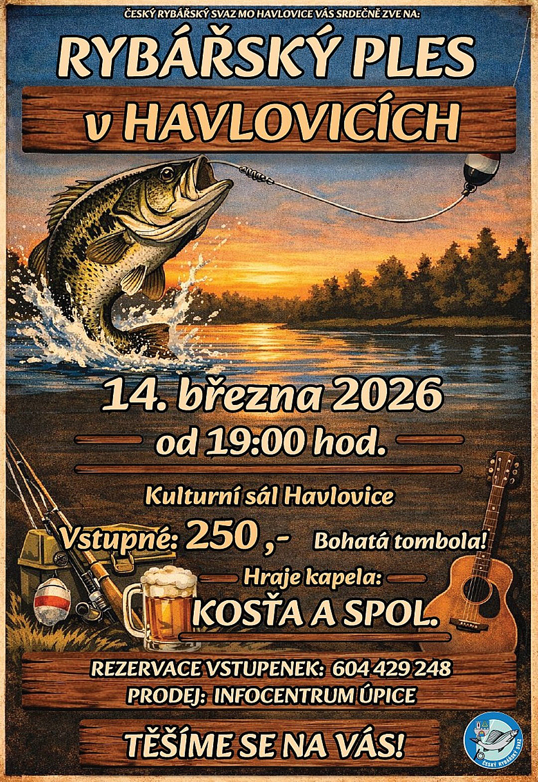 Český rybářský svaz, místní organizace Havlovice, vás srdečně zve na Rybářský ples, který se uskuteční v sobotu 14. března 2026 od 19:00 hodin v kulturním domě v Havlovicích.