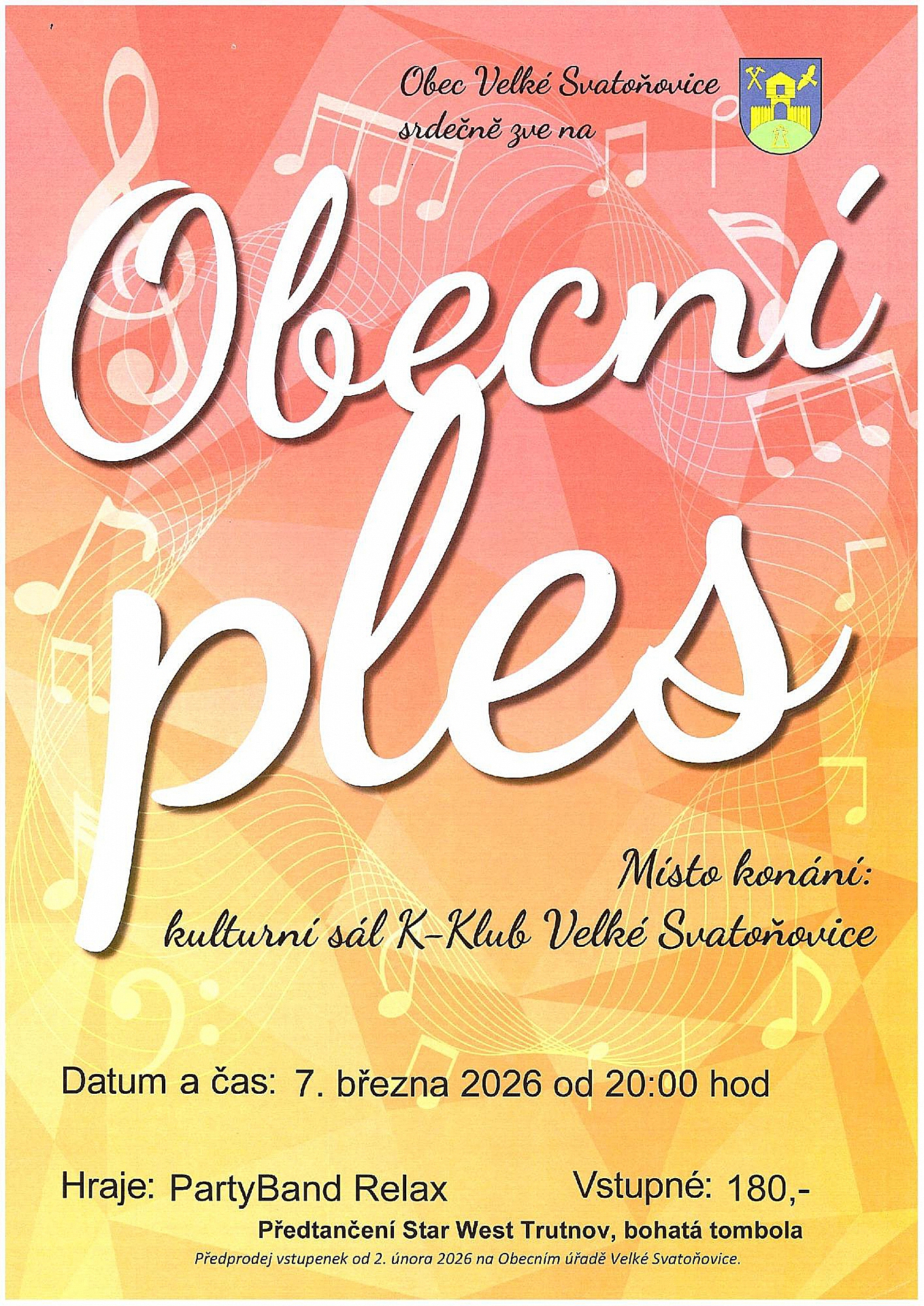 Obec Velké Svatoňovice srdečně zve všechny občany i přespolní na tradiční Obecní ples, který se uskuteční v sobotu 7. března 2026 v Kulturním sále K-Klub Velké Svatoňovice.
