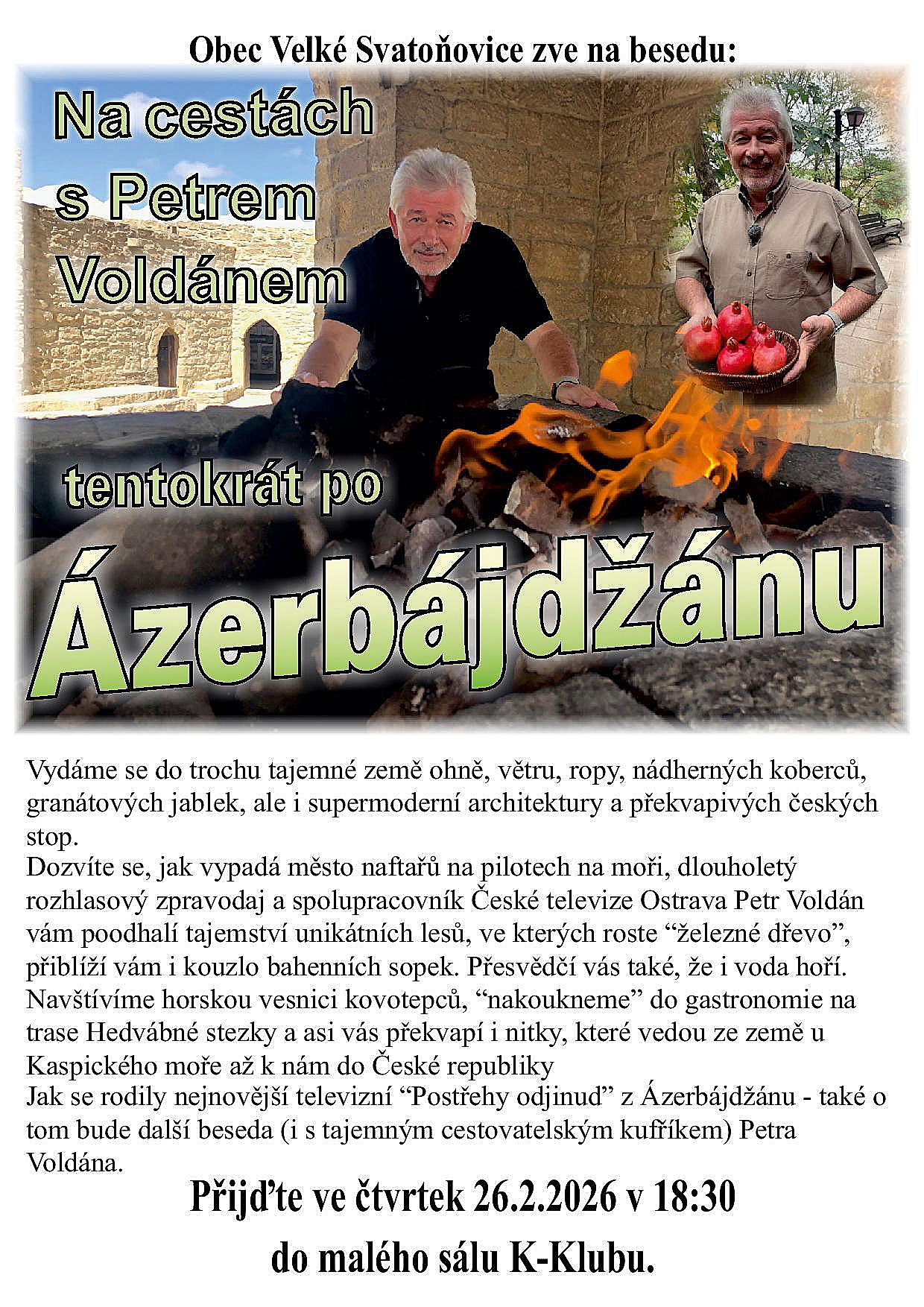 Obec Velké Svatoňovice zve na další poutavé vyprávění cestovatele a novináře Petra Voldána. Tentokrát se vydáme do tajemné země u Kaspického moře, kde se snoubí historie Hedvábné stezky s ultra moderní architekturou.